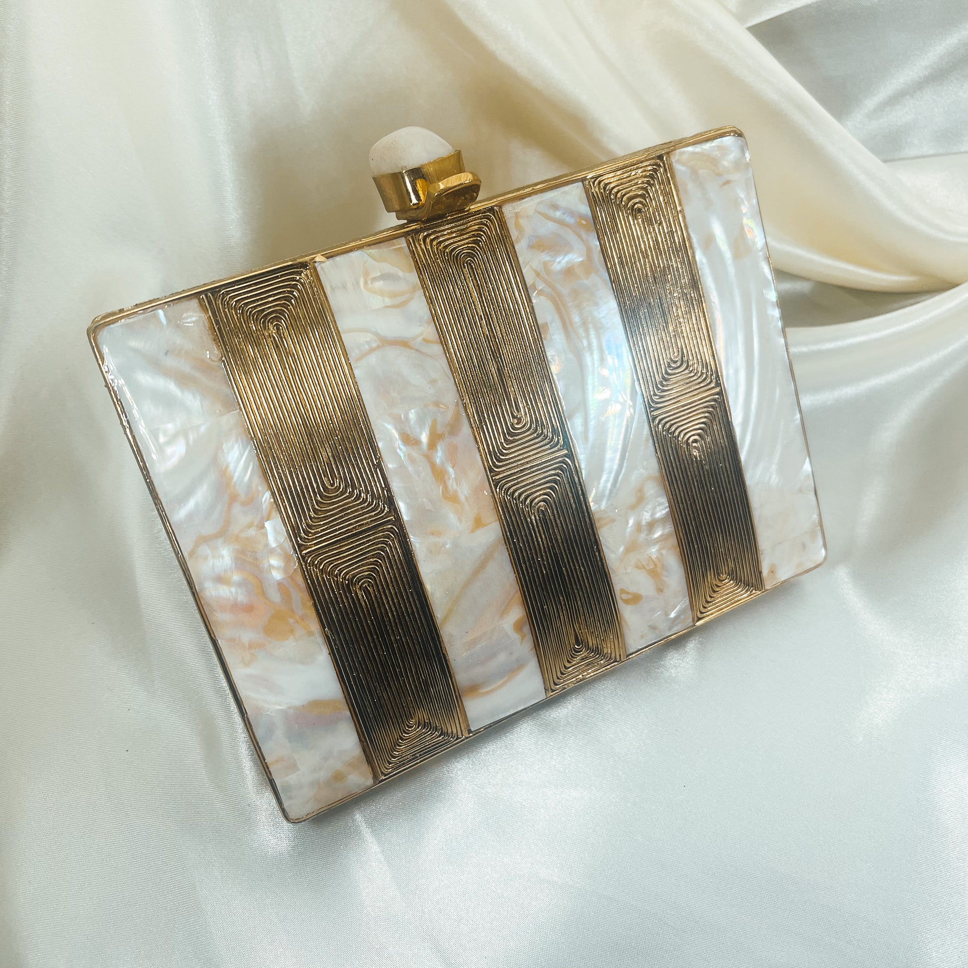 Luxury Mother of Pearl clutch with hand crafted and embossed detailing. Elegant, stylish and a very unique with a modern design.