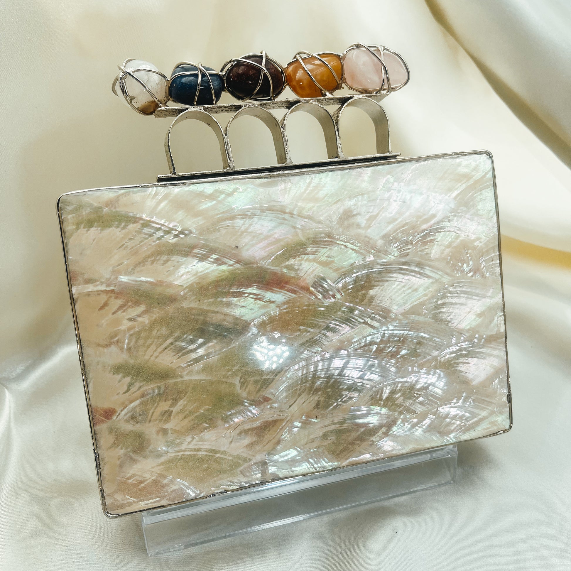 This gorgeous Mother of Pearl clutch is one-of-a-kind and has the entire front of pearl giving it a simple and elegant pearl. The finger clasp with five different colored stones is very unique and adds a pop of color to the clutch!