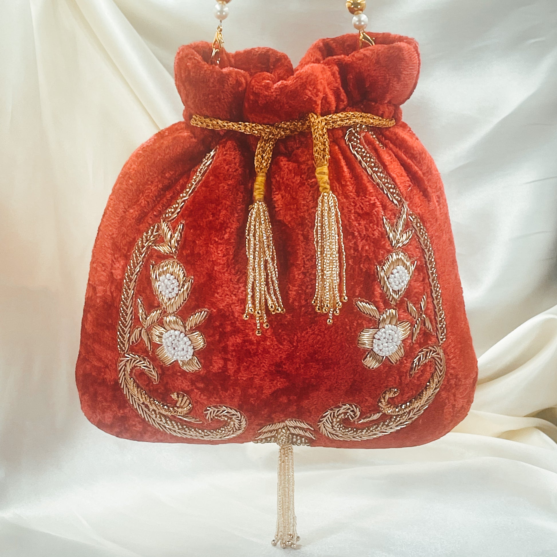 This gorgeous velvet potli with gold embroidery design is that simple and elegant piece you’ve been looking for!