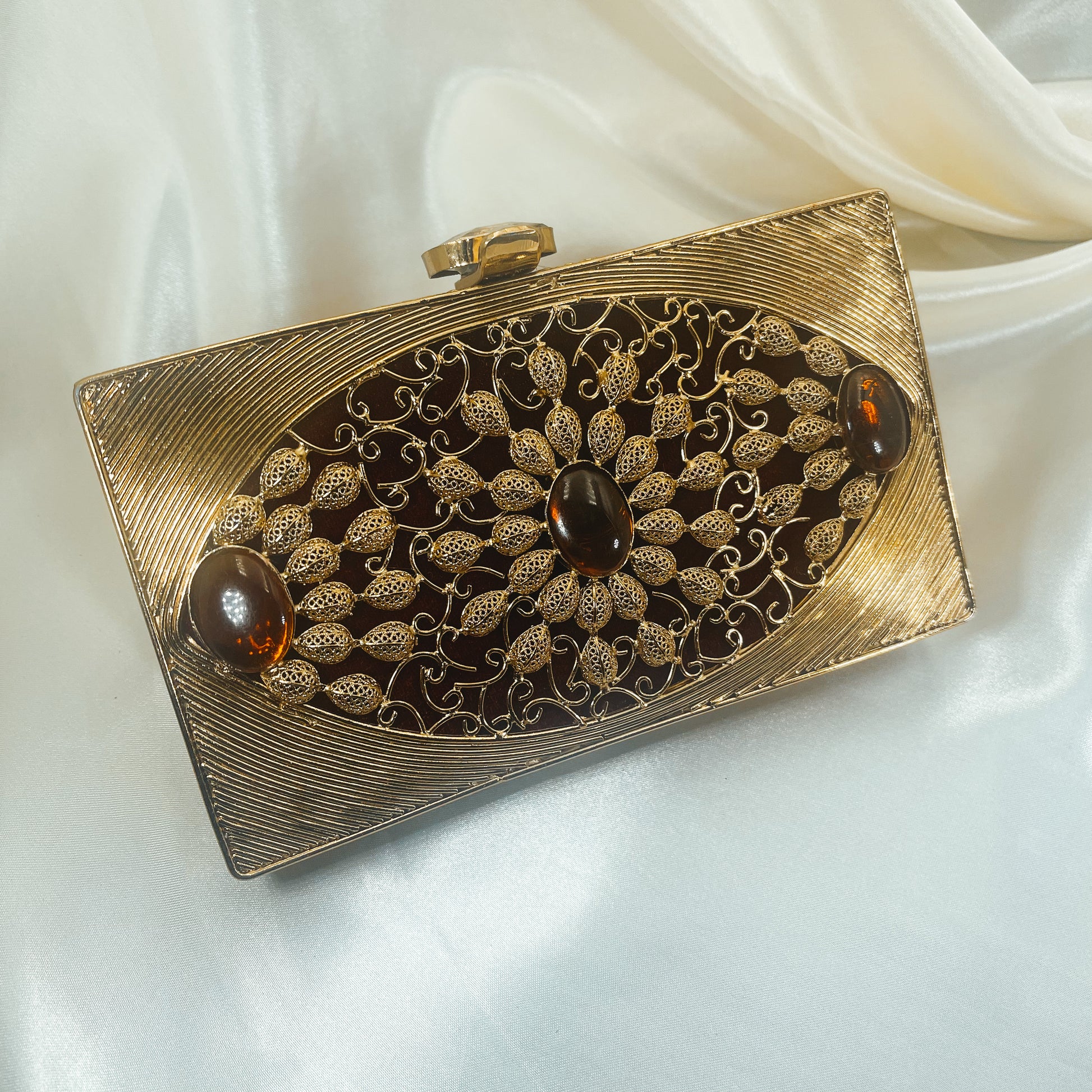 Luxury Mother of Pearl clutch bag with hand crafted and embossed detailing. Based on an antique gold brass frame, intricately cut and detailed on both sides. This piece has beautiful ruby colored base and stones giving a look of pure royalty. The back side is just as beautiful with antique gold carved work.